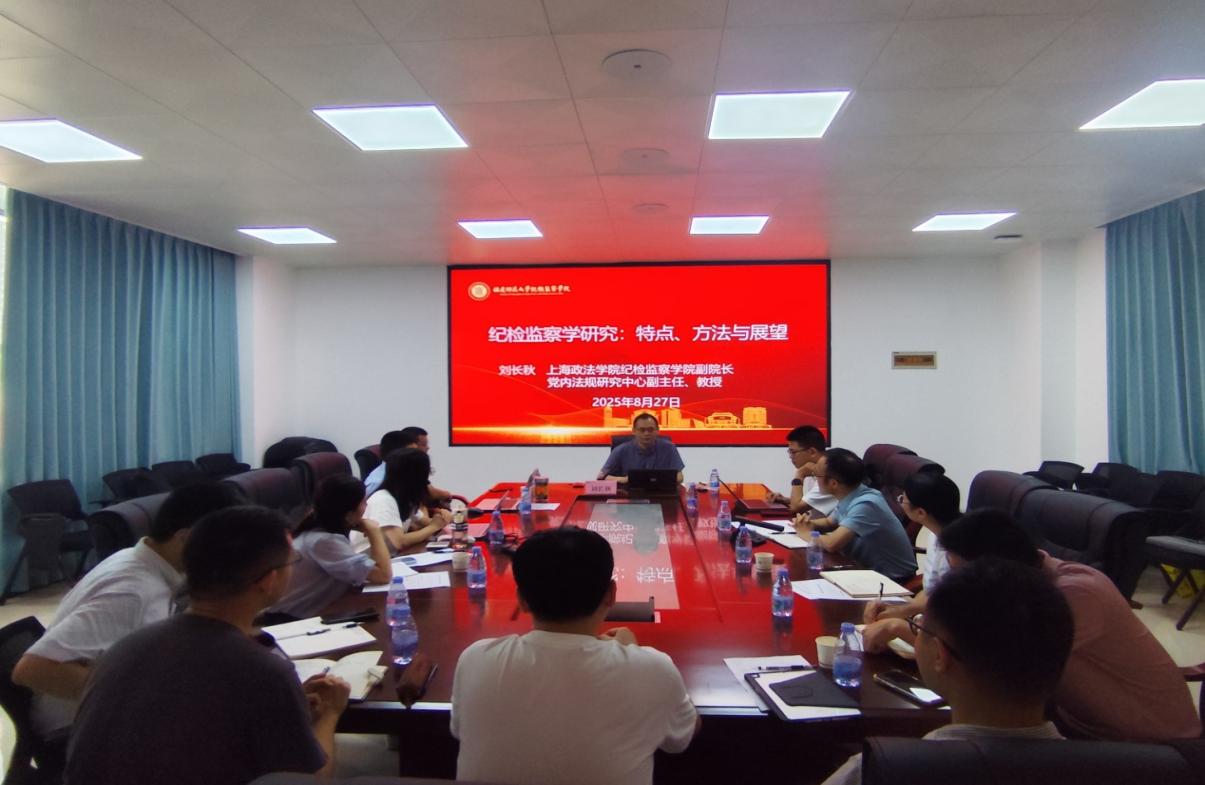 8月27日,上海政法学院纪检监察学院副院长刘长秋教授带队来院调研交流。学院院长陈超凡、副院长田振洪以及有关教师代表参加了座谈。
